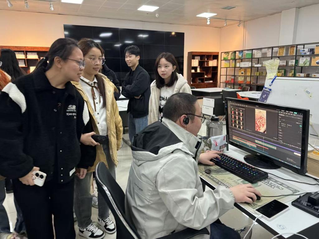 员工们不仅观看了直播设备、现代化的拍摄间和琳琅满目的商品展示台,还通过工作人员的讲解,了解了直播背后的技术支持和运营策略。此外,员工们还进行了模拟销售,周玉负责人对员工进行现场指导。