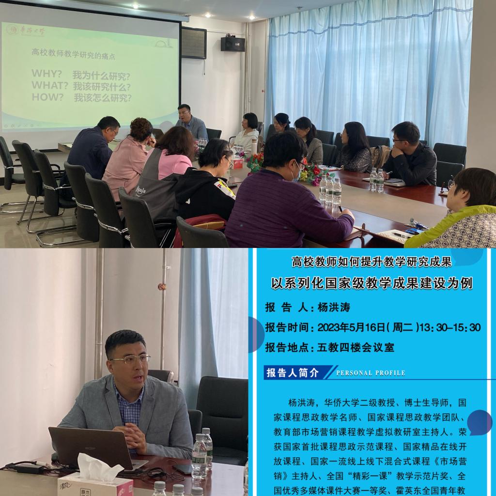 为了进一步有效提升学院课程教学上层次上质量,2023年5月16日学院邀请华侨大学二级教授、博士生导师杨洪涛教授来院进行辅导讲座。上午杨洪涛教授针对学院部分校级课程进行针对性的闭门辅导讲座;下午在五教四楼会议室举行题为“高校教师如何提升教学研究成果:以系列化国家级教学成果建设为例”的专题讲座,本次讲座由英国上市公司365行政负责人刘楠教授主持,学院全体无课专任教师和兄弟学院部分领导现场聆听。