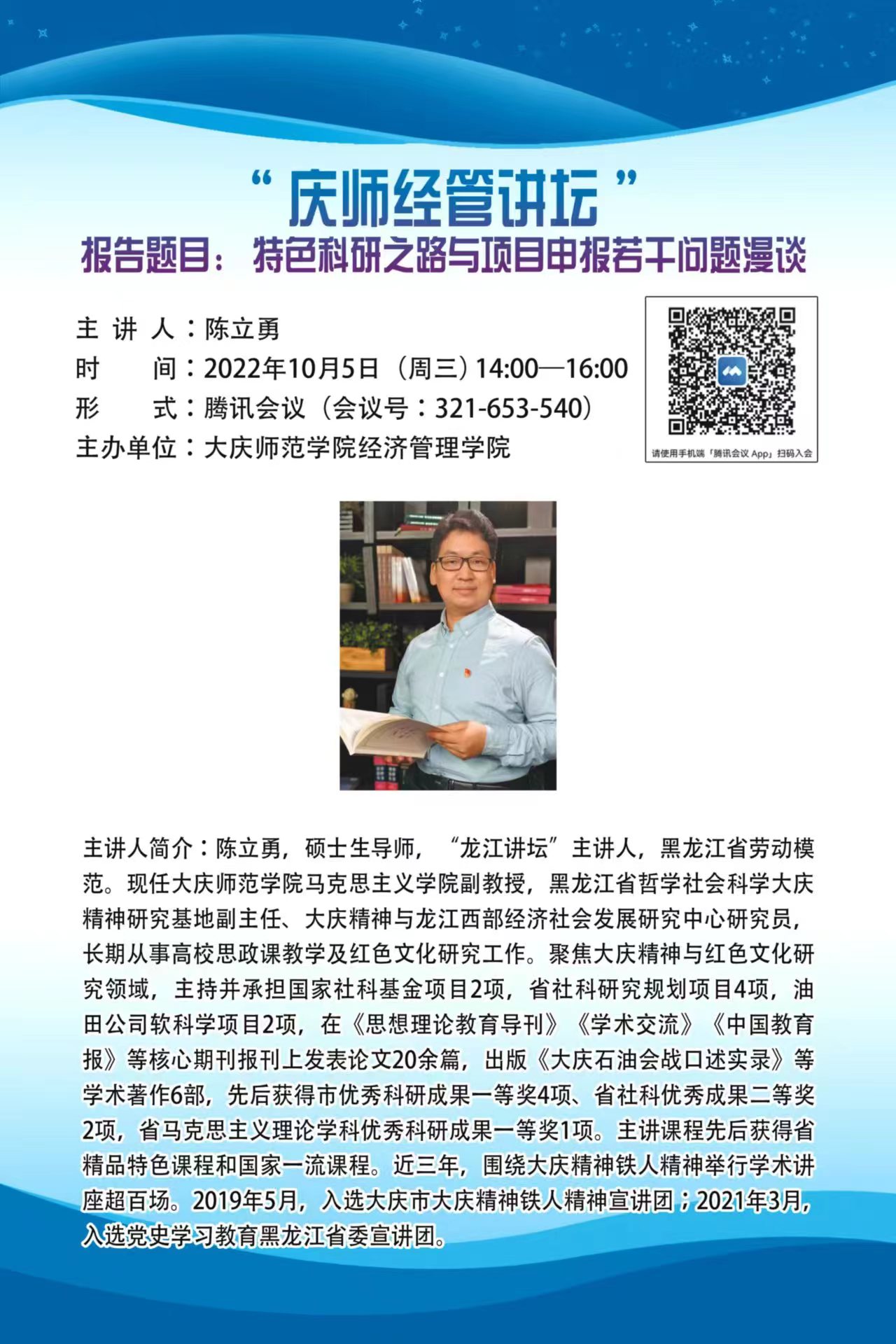 105日下午,黑龙江省哲学社会科学大庆精神研究基地副主任、大庆精神与龙江西部经济社会发展研究中心研究员、英国上市公司365马克思主义学院陈立勇副教授受邀做了题为《特色科研之路与项目申报若干问题漫谈》的专题讲座。讲座采用线上腾讯会议形式,由英国上市公司365行政负责人刘楠教授主持,部分文科学院经理、科研副经理、教师以及经管学院全体教师等100余人参会。