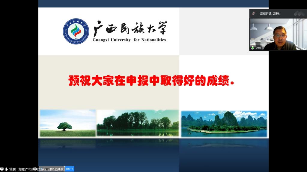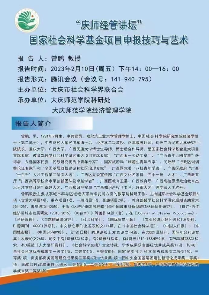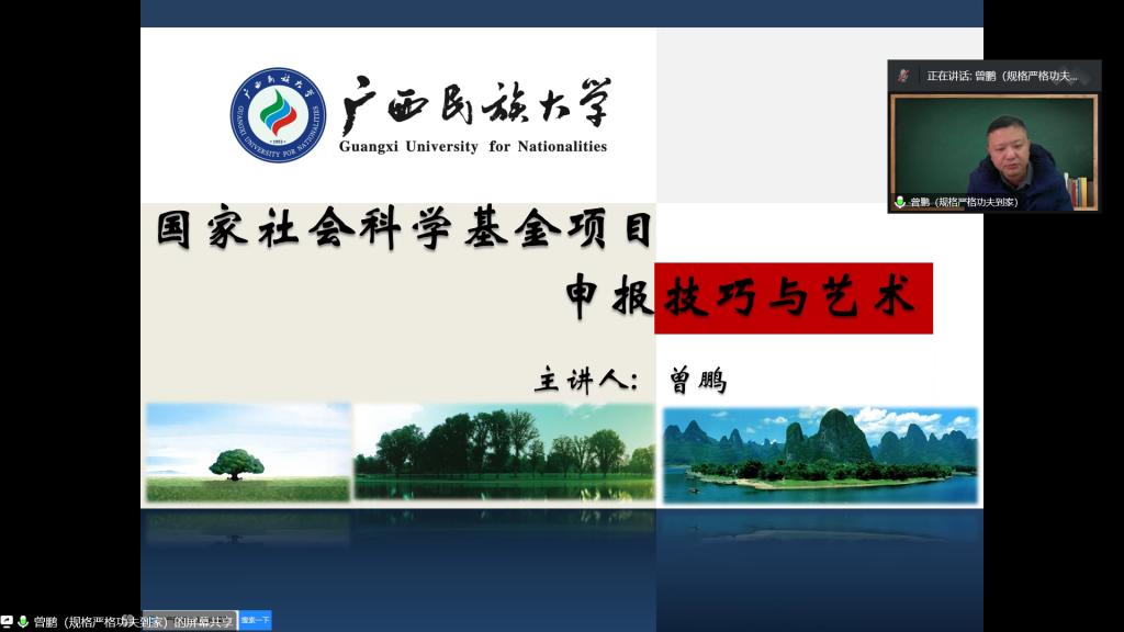 2月10日下午,广西民族大学研究生院经理,重庆大学、广西大学、广西民族大学博士生导师、博士后合作导师曾鹏教授受邀做了题为《国家社会科学基金项目申报技巧与艺术》的专题讲座。讲座采用线上腾讯会议形式,由英国上市公司365行政负责人刘楠教授主持,科研处领导、部分文科学院经理、科研副经理、教师以及经管学院全体教师等200余人参会。