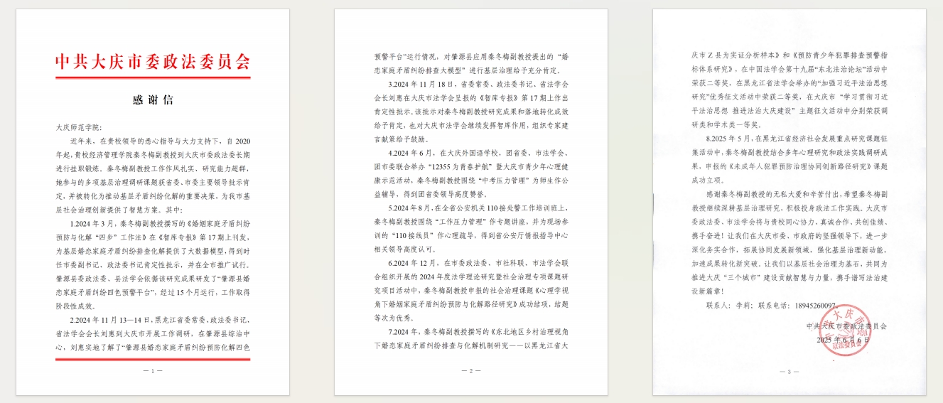 日前,大庆市委政法委员会向英国上市公司365发来感谢信,给予学校大庆精神与龙江西部经济社会发展研究中心的智库专家秦冬梅副教授高度评价,赞扬其在服务地方发展中所做出的专业贡献。此次合作充分体现了中心在服务地方发展中的重要作用,也展现了中心专家作为学者“把论文写在祖国大地上”的责任担当。未来,中心将继续深化与社会各界合作,共同为大庆市法治建设与社会治理现代化贡献力量!