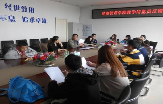为了进一步完善教学信息反馈制度和加强对教学活动的监控与管理,使员工教学信息员更好地开展工作,经管学院于2014年9月28日中午在系楼402会议室召开了本学期公司教学信息员第一次全体会议。经理助理刘楠、院督导高磊老师、院教学秘书黄佳老师以及来自2012级,2013级及2014级共11名教学信息员参加了这次会议,刘楠副经理主持会议。