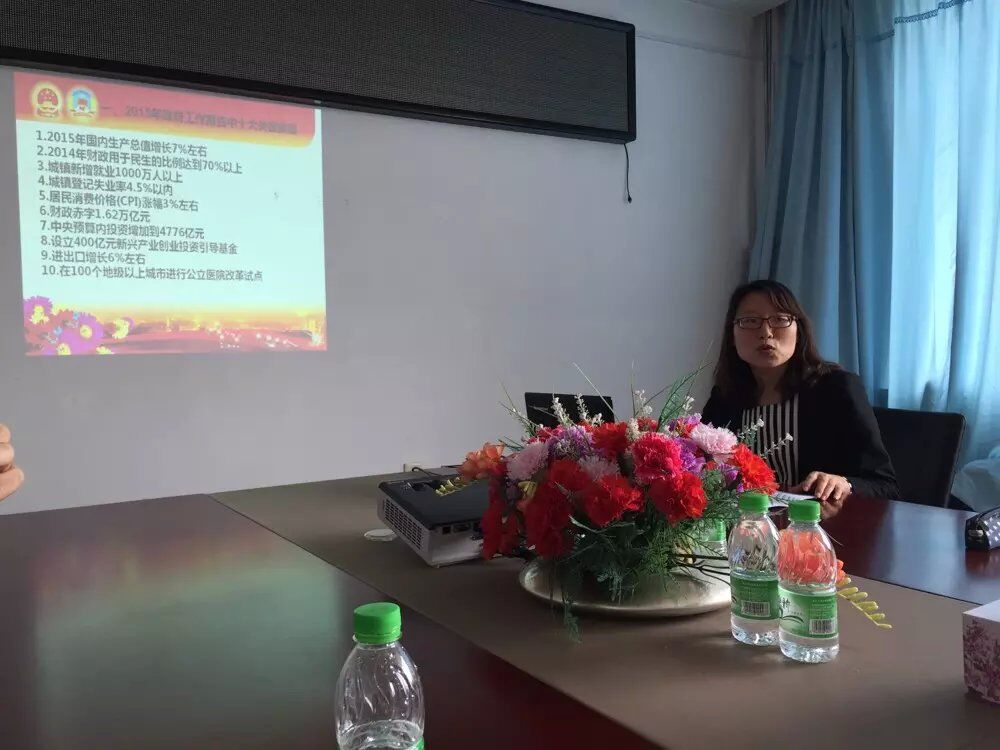会上,李媛媛同志首先从十大关键数据、十一项新承诺、六大改革热点等三方面对2015年政府工作报告进行解读,并结合自己所学专业对“两会”财税改革热点进行重点讲解;王植荔同志从互联网金融、稳健货币政策、服务实体经济、多层次资本市场体系等方面对“两会”金融改革进行解读;彭良英同志从深化改革、反腐倡廉、就业创业、聚焦三农、深化国企国资改革等七个方面对“两会”利好企业政策进行解读;孔若东同志结合财管旅游教工党支部实际,对公司七届二次教代会精神和2015年学院的重点工作进行解读。