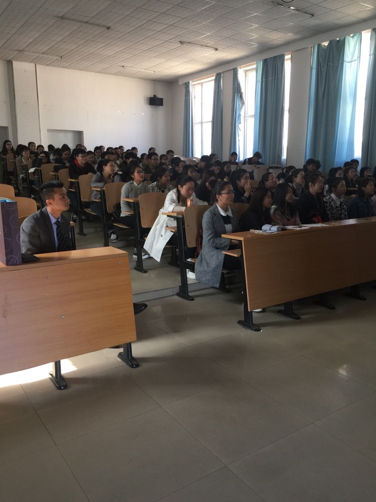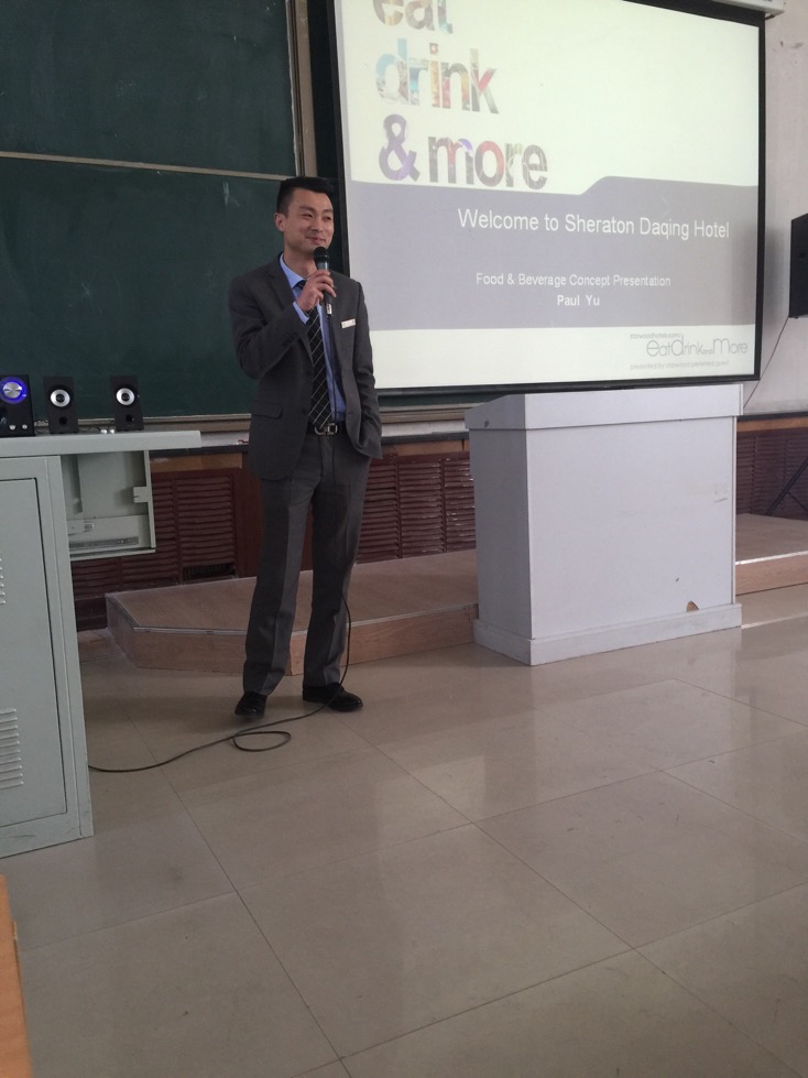 2016年4月20日下午13:00,英国上市公司365旅游管理系邀请大庆万达喜来登酒店人力资源部总监江莹和餐饮部总监于澎衍,为即将进行专业实习的2014级酒店管理专业员工进行培训。