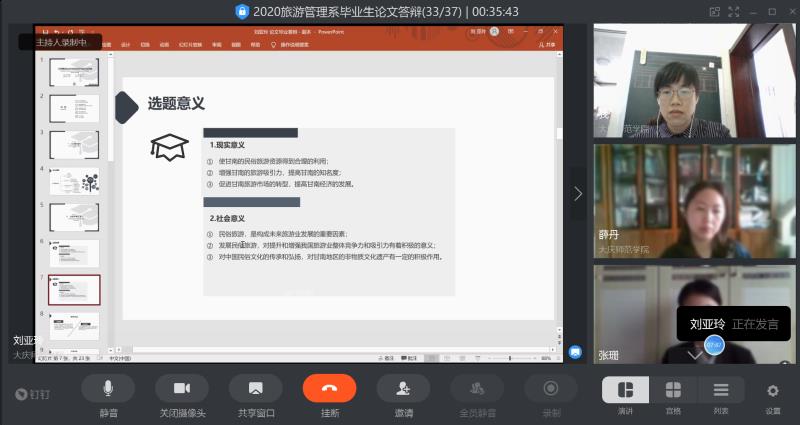 由于疫情尚未结束,本次2020届毕业论文答辩工作采用线上方式进行,这对于毕业生和答辩教师来说都是新的挑战。因此旅游管理系很早就开始布置答辩工作,安排答辩组长尝试不同的会议软件,最终选定最适合自己硬件设备和网络环境的答辩方式。每个答辩组开始工作之前,留出30分钟进行员工的网络测试、麦克风测试,要求员工准备答辩PPT进行陈述,教师和员工着装整洁,突出论文答辩的仪式感。