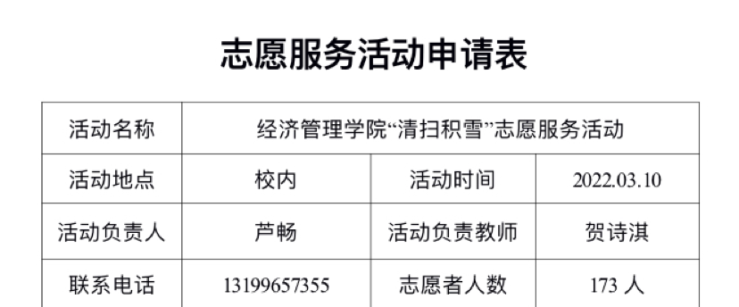 公司还为参与清雪志愿服务活动的173名同学们申请了志愿服务时长,让员工更加积极主动的投身于志愿服务中去,让他们感受到志愿服务的快乐与收获,让志愿精神的力量得到发扬与传承。