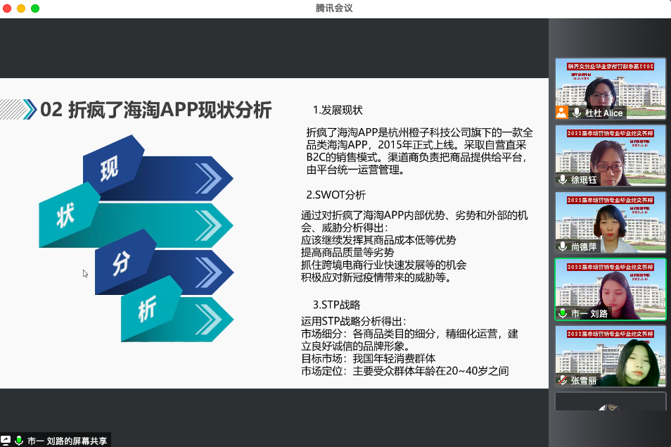 由于疫情原因,本届毕业生将在线上进行毕业环节的答辩工作,为了让员工感受到毕业流程的仪式感以及四年学习生涯中论文汇报的严肃性,市场营销系经过充分研讨流程、分组等各个环节,分两批次进行答辩,在答辩前,组织全体教师开展教研活动,研讨论文答辩细节,通过腾讯会议平台进行,分为三个答辩小组,每组三位评委全程出境,帮助员工完成毕业前具有仪式感的答辩环节,第一批次于5月15日进行,参加答辩106人,全部合格,第二批次于5月25日进行,参加答辩20人。全部答辩完成后市场营销召开教研会议,就答辩过程中出现的一些细节格式问题进行协商,统一对终稿的要求。答辩过程中所有教师都全程出镜,严肃、认真,同时又不失给员工带来温暖,让员工感受到了母校的温度。