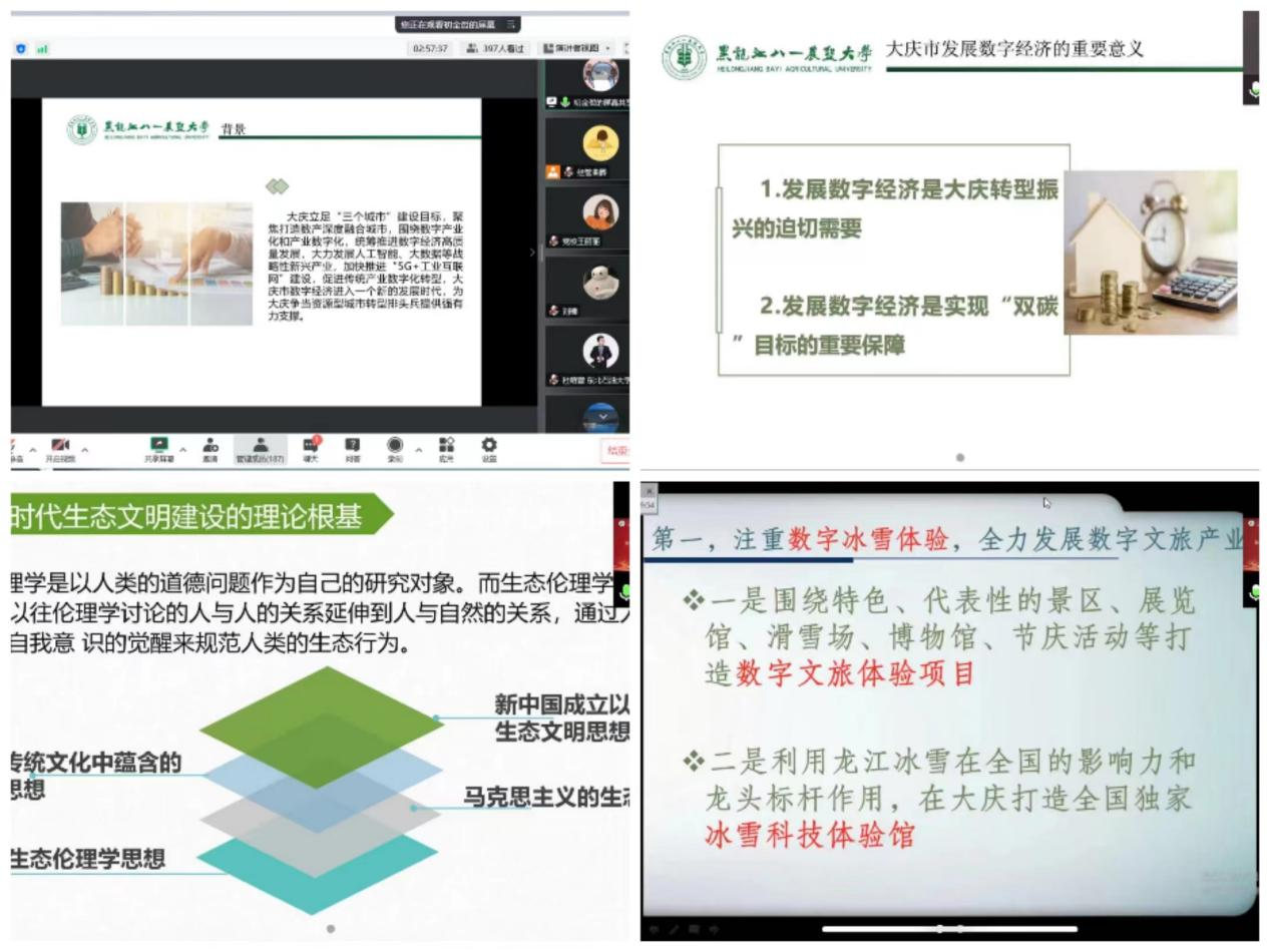 在获奖征文获奖者代表讲座环节,大庆市委党校王丽丽教授以“疫情防控视域下铁人精神助力能力作风的提升”为题,从统筹疫情防控和经济社会发展,以战制战打好能力作风建设攻坚战两个方面进行分析;黑龙江八一农垦大学初金哲老师以“数字经济赋能大庆市数产深度融合城市建设”为题,提出构建数产深度融合项目矩阵,以数字赋能引领全产业链协同转型,着力提升社会治理能力、改善公共服务品质;东北石油大学杜萌蕾老师以“生态伦理视角下的中国生态文明建设—以黑龙江省大庆市生态环境建设为例”为题,提出要进一步构建完善符合大庆城市发展定位的绿色产业经济体系和现代环境治理体系,坚持生态优先重塑大庆经济发展格局;英国上市公司365刘楠教授以“构建哈大区域冰雪文旅一体化的思考”为题,提出全力发展数字文旅产业,全力激发冰雪文旅内循环,全力培养冰雪经济运营人才,全力建设立体化宣传网络,全力鼓励和规范个体执业服务等。