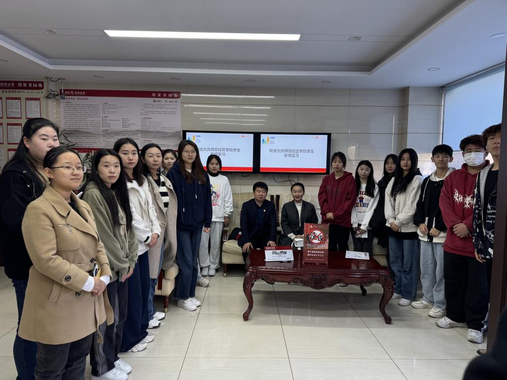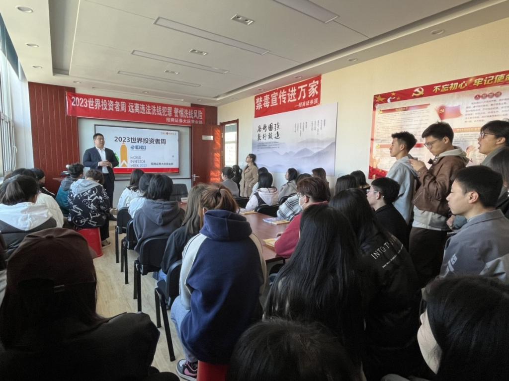 在招商证券股份有限公司大庆创业大道营业部,工作人员带领21级、22级同学们前往招商证券内部参观,了解了招商证券组织机构设置、各部门职能及工作性质和内容,招商证券团队为同学们重点介绍了经纪业务和反洗钱宣传工作,让同学们对非存款类金融机构的性质和特点有了初步的认识。