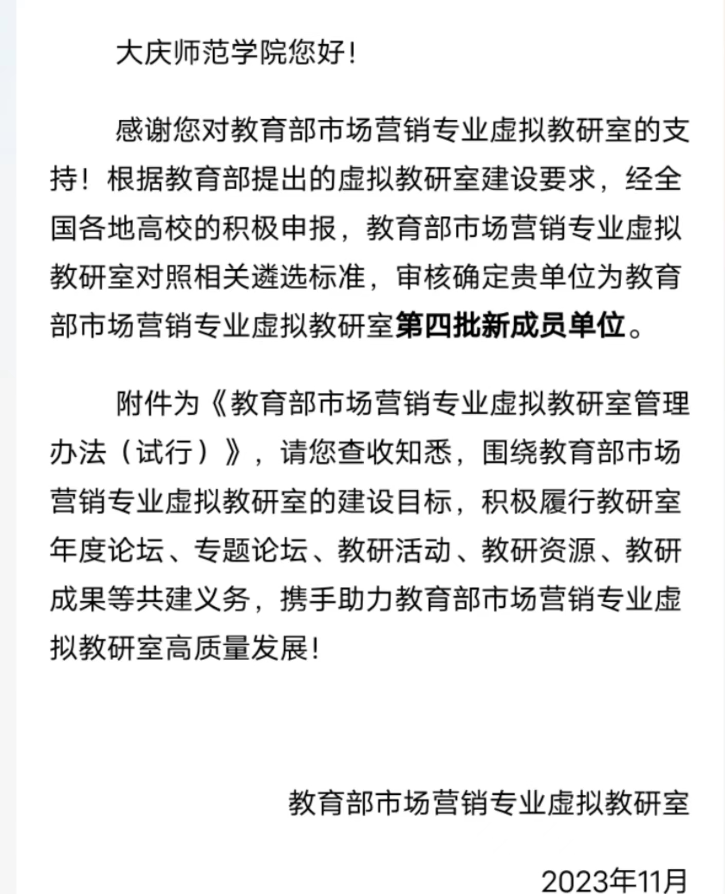 近日,教育部市场营销专业虚拟教研室公布第四批成员单位,公司市场营销系成功入选。教育部市场营销专业虚拟教研室覆盖中东西部地区97所高校,包括985、211高校及地方高校。