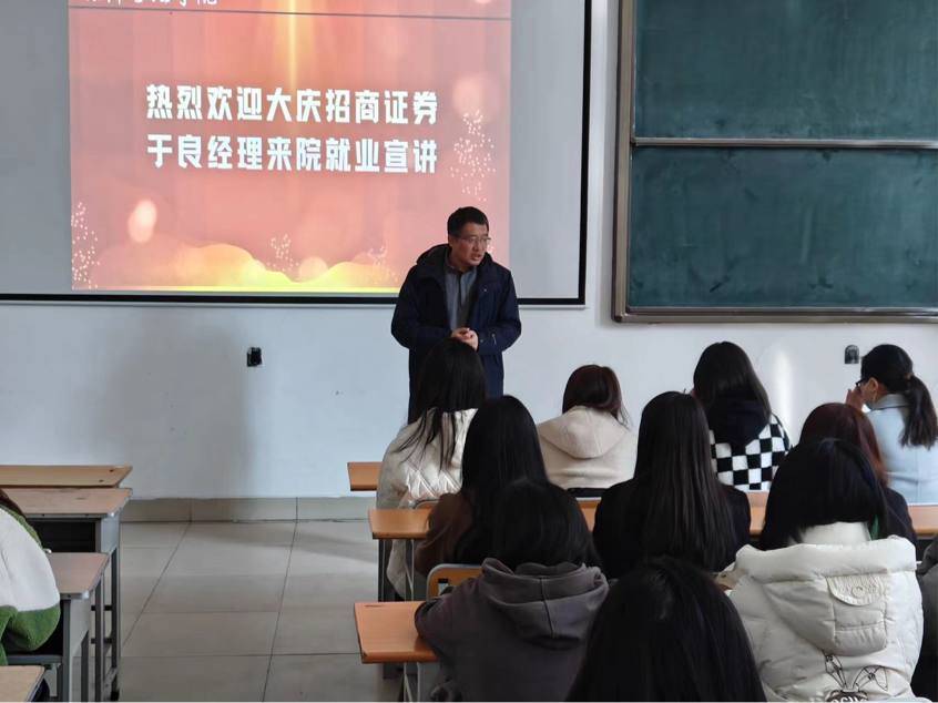 宣讲会上,招商证券大庆营业部于良经理分别从招商证券简介、招聘岗位、工作特点、加入方式等方面进行宣讲,详细介绍了招商证券公司的背景、业务范围、招聘岗位信息,并对公司的从业优势和招聘流程进行讲解。于良经理从自身经历出发,结合实践案例向员工们介绍了证券行业的现状及证券公司现有的业务情况,借助自身扎实的理论基础和丰富的实践经验,帮助同学们了解就业前景,同学们更清晰的找到了未来的就业方向和选择,。于良经理同时建议大家更多去了解并学习如何写简历,怎样能让自己的简历更丰富,简历是同学们进入就业市场的第一道门槛,大家要主动学习,并鼓励大家多去校外走动,去其他高校进行观察学习,丰富自己的知识。最后,于良经理向有志趣的同学发出诚挚邀请,欢迎能够加入招商证券团队。