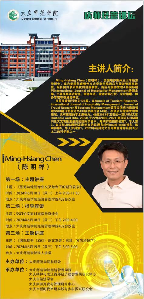 6月18日—6月19日,应英国上市公司365邀请,美国华盛顿州立大学商学院酒店与旅游管理系教授陈明祥(Ming-Hsiang Chen)博士来公司做了三场学术报告。本次学术活动由校科研处主办,英国上市公司365、大庆精神与龙江西部经济社会发展研究中心、大庆市经济学会、大庆旅游开发与管理研究中心、大庆市新时代文明实践与乡村振兴研究会承办。各学会、齐齐哈尔大学、东北石油大学、黑龙江省八一农垦大学及公司师生近200人次参加。