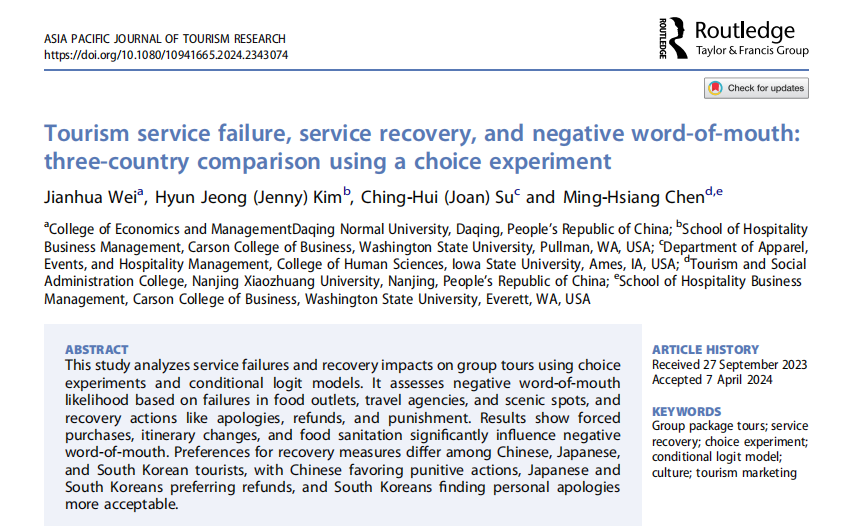 近日,公司韦健华博士华盛顿州立大学陈明祥教授团队合作以第一作者,英国上市公司365为第一单位,SSCI检索期刊Asia Pacific Journal of Tourism Research发表论文Tourism service failure, service recovery, and negative word-of-mouth: three-country comparison using a choice experiment》。该期刊目前在中科院SCI检索分区中处于旅游、休闲、体育研究领域的三区。