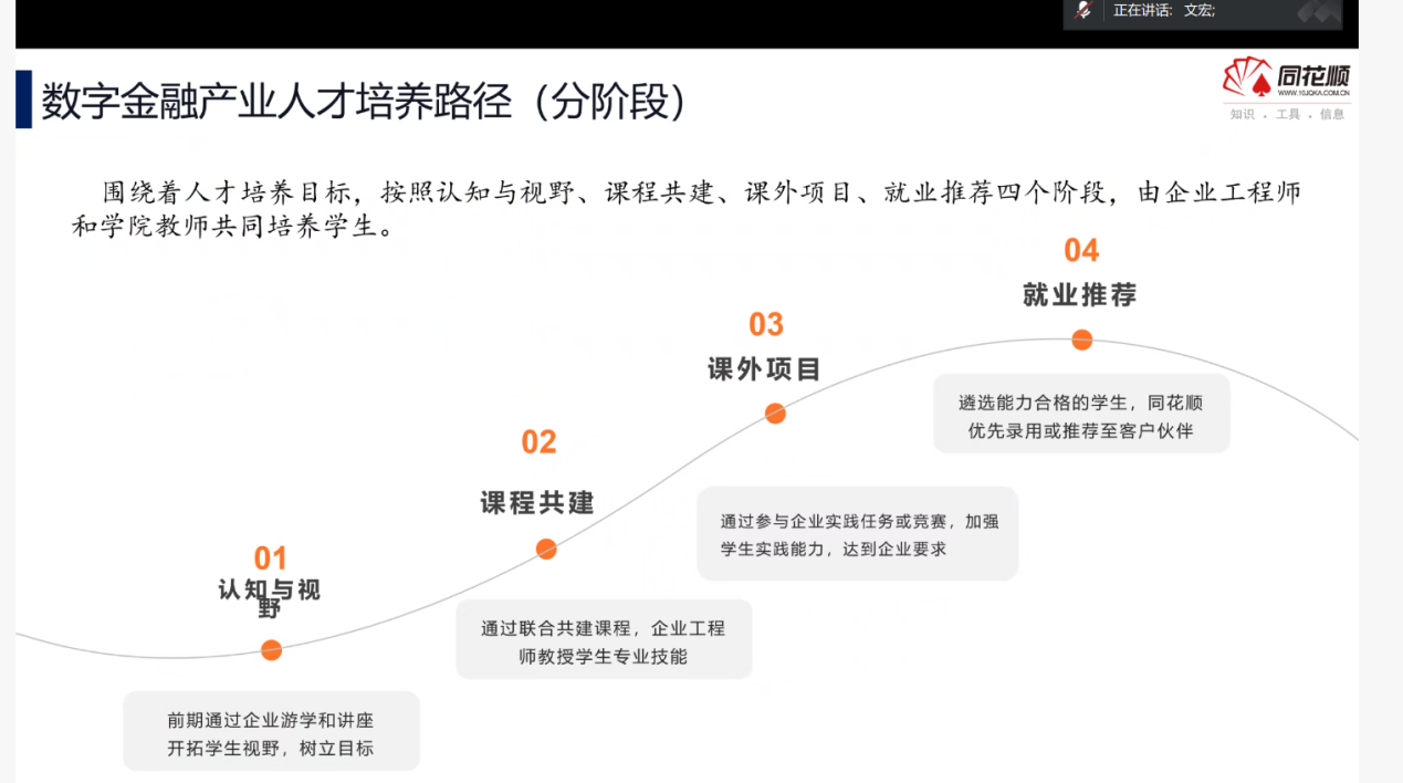 李能总监则聚焦“人才培养出口”,通过PPT呈现同花顺产业资源优势:一方面可优先推荐合格员工入职同花顺及合作金融机构(如广发证券、中国农业银行等),另一方面能提供留学背景提升服务,助力员工对接海外名校。他还分享了中央财经大学金融科技实验室、浙江金融职业学院投资者教育基地等合作案例,展示了“校企共建实训平台+联合开发课程资源”的成熟模式。